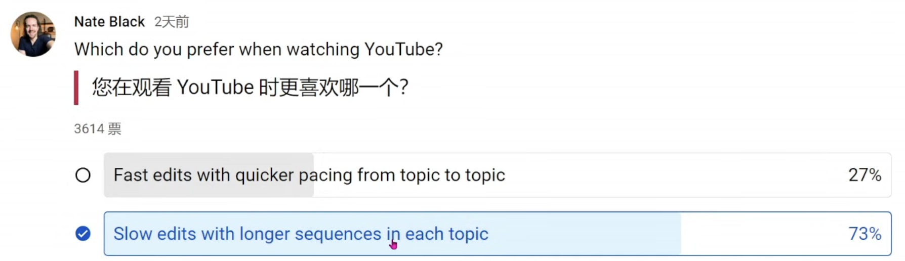 YouTube(世界最大的视频网站)博主做过一个投票选择,关于更喜欢快内容还是慢内容。出乎大家意料的是:更多的人(73%)喜欢慢内容。